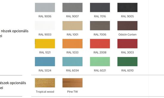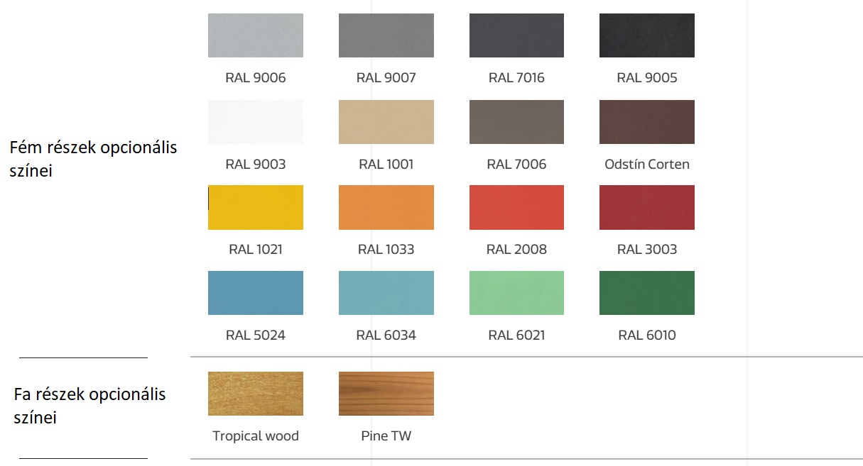 Kivitel:  horganyzott acélszerkezet porszórt bevonattal. A borítások tömör fa panelekből állnak, amelyeket a tartószerkezethez csavarozott rozsdamentes acél csavarok rejtenek. Belső polipropilén tartály túlfolyó lyukakkal van ellátva, hogy megakadályozzák a növények vízének túlcsordulását.