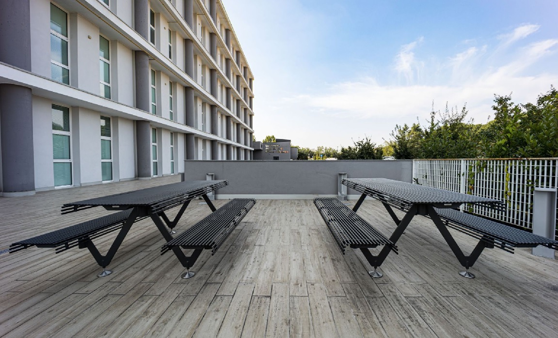 Moduláris pad-asztal, egyenes vagy hullámos kivitelben, Színezett acéllal megerősített Ultra Erős Betonból készűl (UHPC).. Air S az első "demokratikus" asztal a világon, mivel lehetővé teszi a társas életet mind a gyermekek és a felnőttek és a várandós anyák részére a megfelelő pad-asztal távolság kialakításával. Kapható ALFA kivitelben.