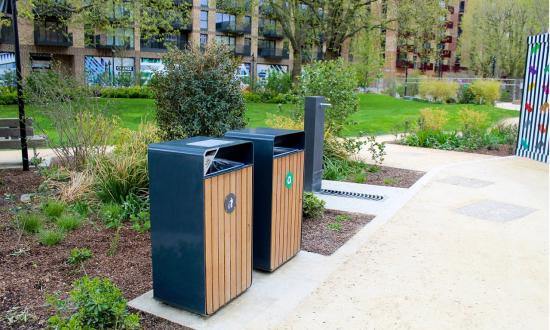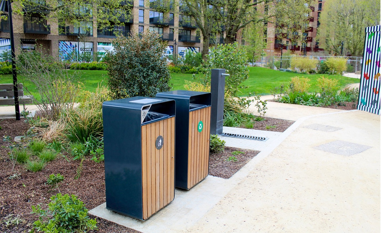 Robosztus fémlemezből és két ajtóból álló modern vonalú szemetes, egy rögzített és egy nyitható tartállyal, rugós acél pengével. Az ajtók lehetnek függőleges teakfa lécek, amelyek rögzíthetők csőszerű acélszerkezetre, függőleges acél rudakra vagy acéllemezre. Rendelhető kör alakú lyuk díszítéssel. is.  A tároló rész acélgyűrűvel van felszerelve a műanyag zsákok tárolásához, kérésre egy hamutartóval is felszerelhető. A szemetes háromféle méretben kapható.