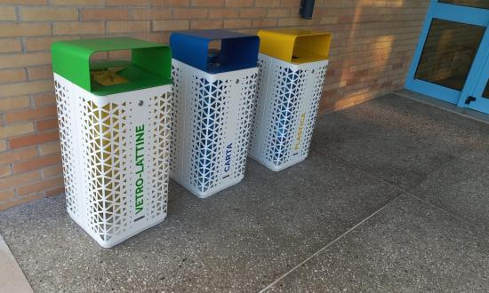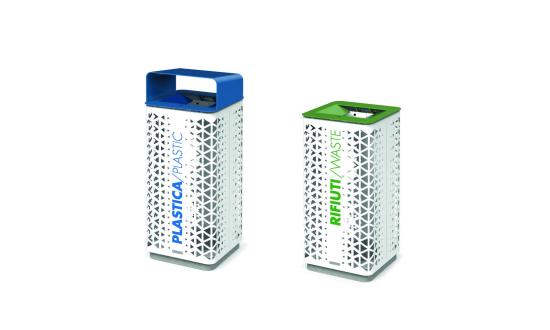 Acéllemezből és lézerfényű díszítőelemekből készült hulladékgyűjtő készlet. A hulladékgyűjtők zárható, lyukkal ellátott tetővel rendelkeznek a hulladék kidobására. Belül egy gyűrű található egy műanyag zacskó rögzítéséhez. A tető speciálisan kezelt az esővíz bejutása ellen. A kukák válogatott hulladék tárolására is alkalmasak.