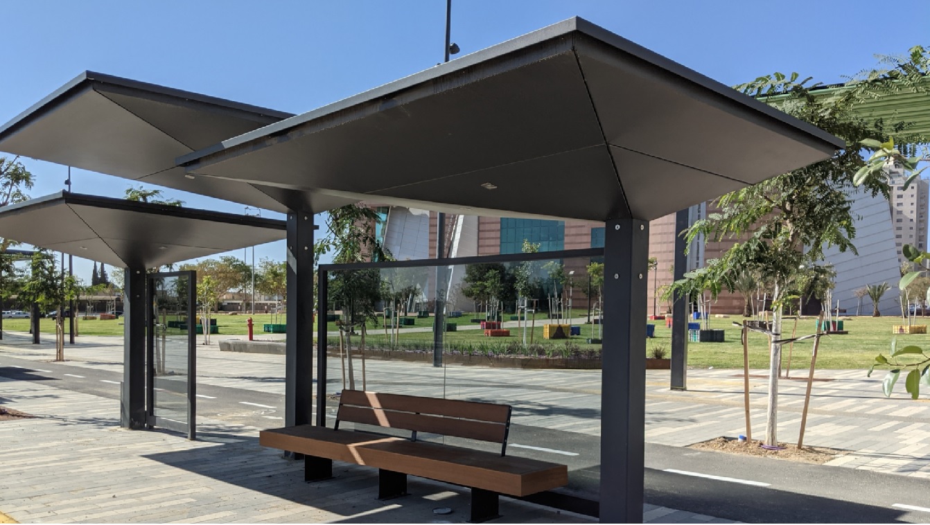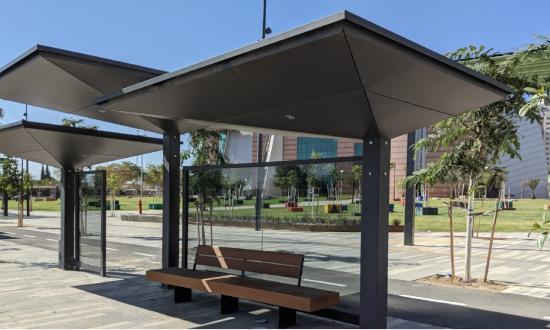 A fordított piramis formájú buszvárók különböző magasságú és méretű egységekből állnak, porszórt acél szerkezettel és tetővel ellátva.