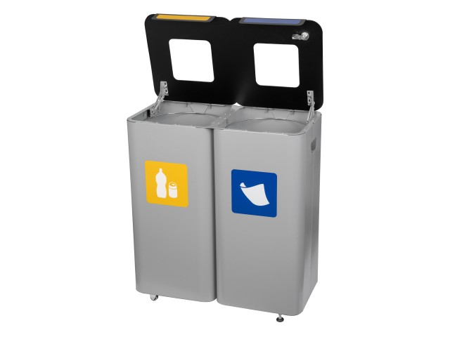 2 x 70 literes beltéri szelektív hulladékgyűjtő egy szilárd és funkcionális megoldás, amelyet háromféle hulladék egy egységben történő kényelmes válogatására terveztek. Tökéletes nagy nyilvános terekbe, irodákba, éttermekbe és más nagy forgalmú helyekre, ahol az esztétika és a funkcionalitás számít.