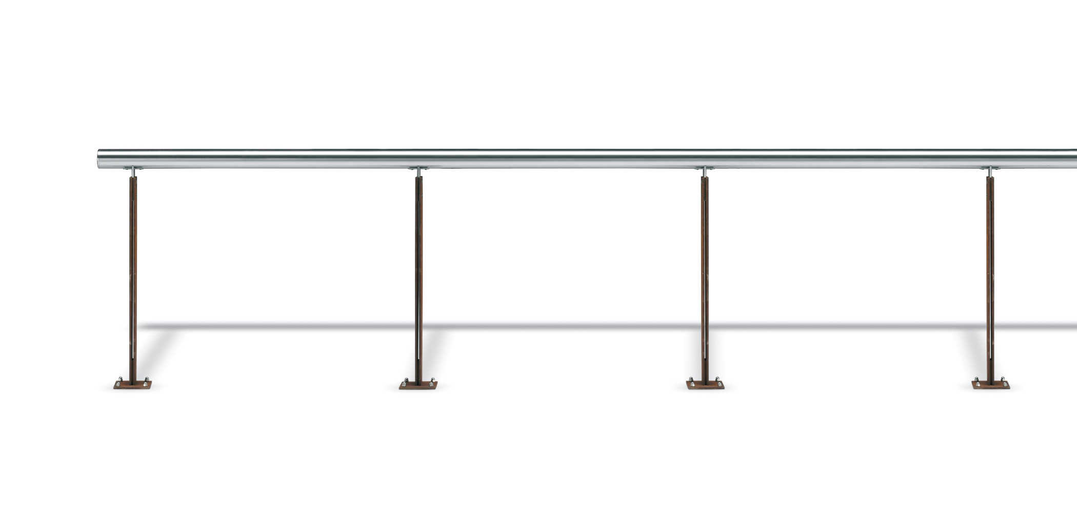Lézervágott, dupla acéllemezből álló, lézerrel vágott, és az alsó rész csavarlapjára, valamint a felső rész rozsdamentes acél tartójára hegesztett moduláris korlát, amely normál és süllyesztett csavarokkal rögzített, A rozsdamentes acél csőkorlát végsapkákkal van ellázva.