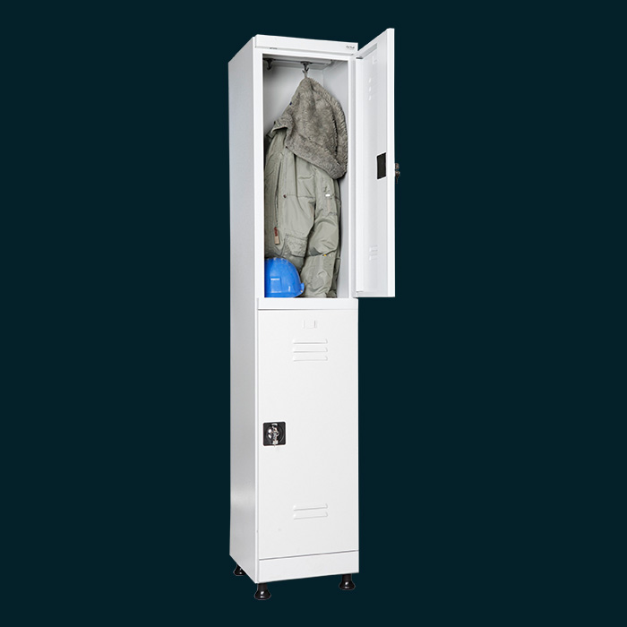 Fém szekrény munkahelyi ruhákhoz, két ajtó egymás fölött.