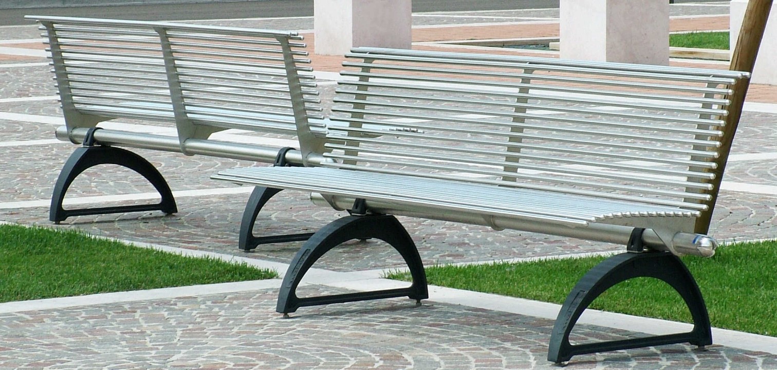 A Libtre formatervezett pad és lóca egy robusztus vizszintes acélcsőhöz kapcsolódó acélcsövekből készűl.