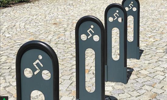Rugalmas és tartós keréktartó. Az alap hegesztett acélszerkezet, amelynek kerületére egy speciális gumiprofil van rögzítve, amely megvédi a kerékszerkezetet a sérülésektől. A kivágás lyukai kerékpárlakat elhelyezésére szolgálnqak. A kivágás felületébe szöveg vagy logó is beépíthető. Nagyon kíméletes a kerékpárokhoz.