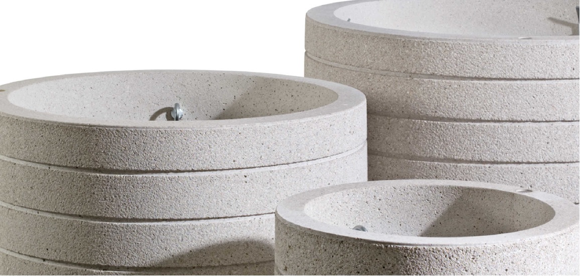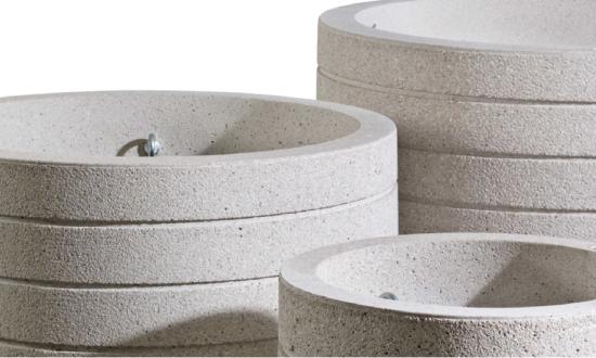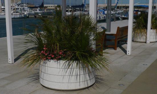 A virágtartók rekonstruált márványból / gránitból készülnek, 15mm vízszintes profilozással. A növénytartókat háromféle méretben kínáljuk, és egy mélyedéssel rendelkeznek, amelyet úgy terveztünk, hogy megkönnyítsék a tisztítását. Belől van 3 emelő szem a mozgatás megkönnyítéséhez. Mindegyik típus képes 50L-100L víz tartalékolására a benne lévő víztartály segítségével.. A két nagyobb méretű virágtartó, díszített fém paddal is rendelhető. Ezek 20 féle színben rendelhetőek és 16 db csavarral rögzíthetők.