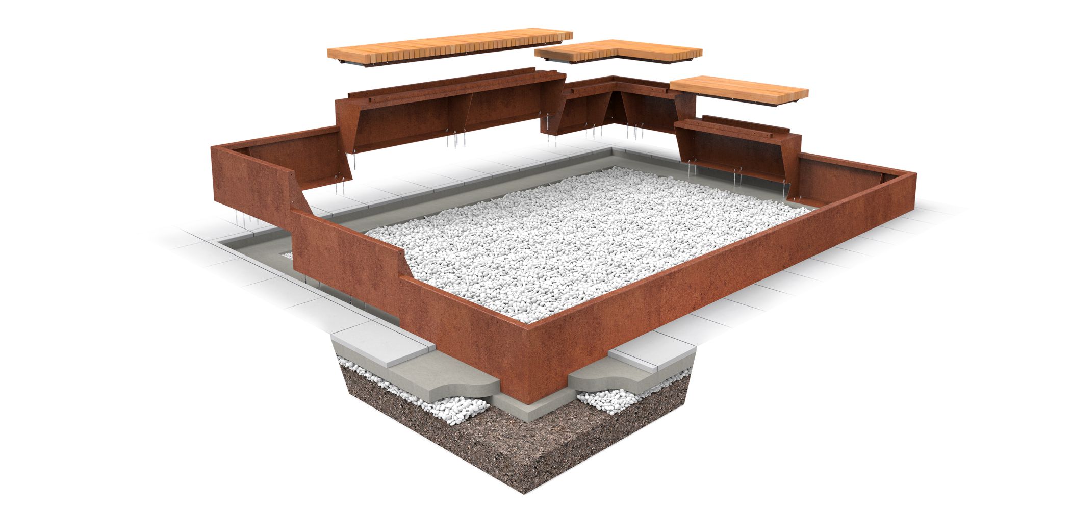 A nagy virágtartó kollekció lehetővé teszi három különböző magasságú és négyzet alakú, téglalap alakú vagy kör alakú virágtartóval a tér lezárását. Anyaga lehet corten vagy porszórt acél. Az ülőke rész anyaga lehet egzotikus fa vagy vörösfenyő. Moduláris elemeinek köszönhetően számos kombinációban telepíthető.
