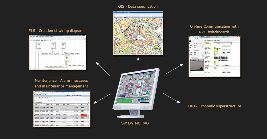 A SW DATMO RVO rendszer komplex megoldást jelent az utcai világítással kapcsolatos információk feldolgozására. Ez egy moduláris szoftver, amely lefedi az ingatlan specifikációtól a karbantartásig és a gazdasági értékelésig terjedő összes problémát. A SW DATMO RVO öt modulból áll, amelyek az ügyfél lehetőségei szerint fokozatosan hozzáadhatók a rendszerhez.