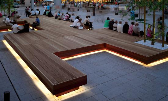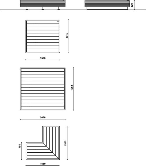 Tömör fa üléses egyenes pad. A széleket erős acél szegély erősíti. Felszerelhető háttámlával is valamint   különböző hosszúságú és szélességű elemekkel a pihenő sziget formgazdagságának megvalósítására. Emellett beilleszthetők más acéelemek is, például virágtartók.