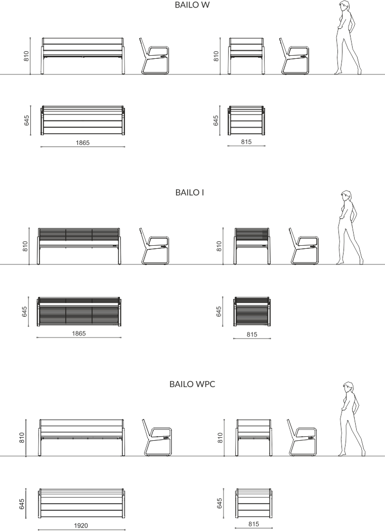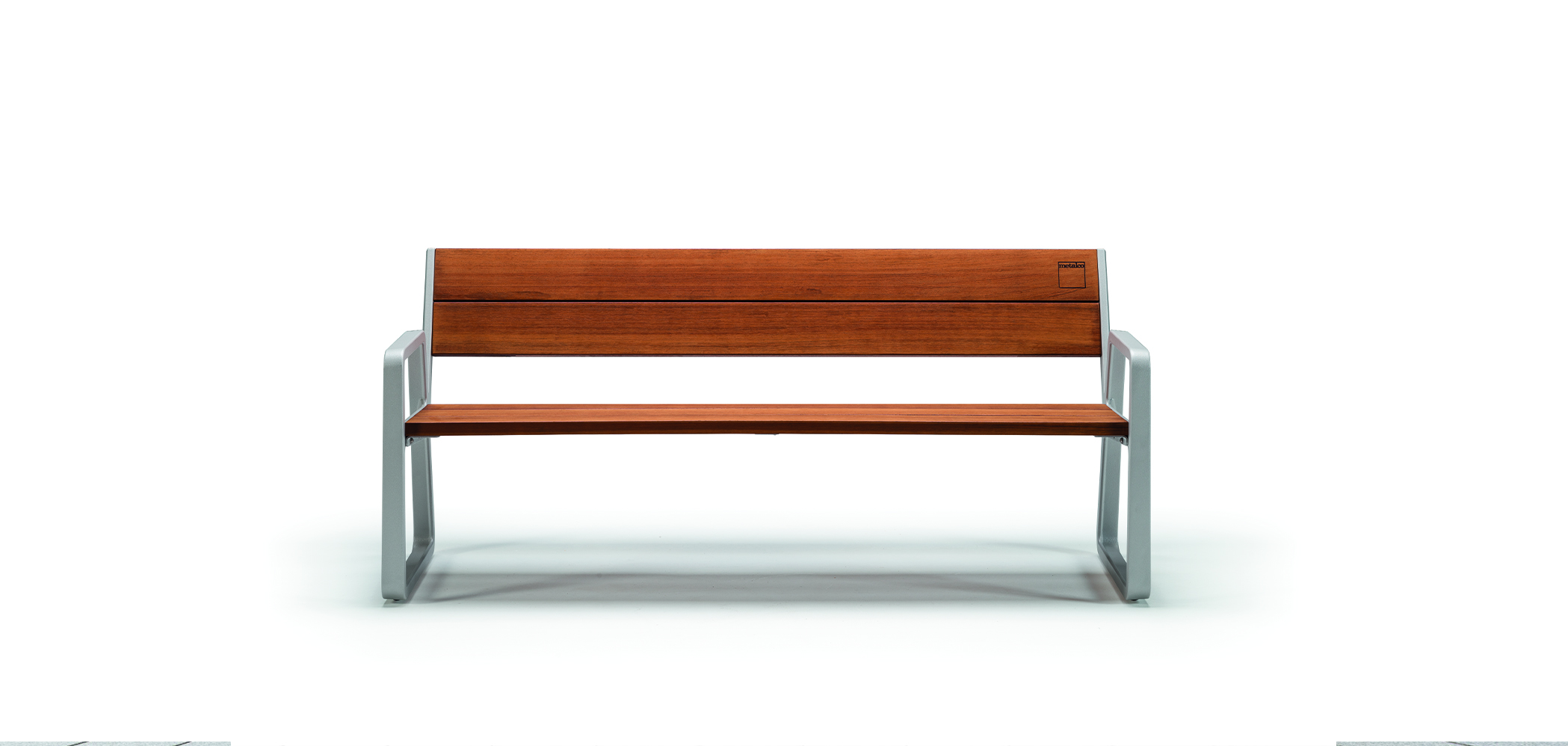 Padok kollekciója acélrudakból / fából / WPC-ből (Wood Polymer Composite) támlából és ülőkéből, két támasztékkal, horganyzott + porfestett öntött alumínium karfáival. Együléses változat is elérhető.