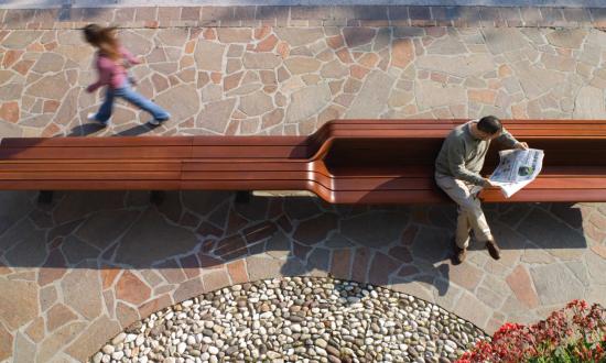 Moduláris padok családja, háttámlával, két támasztékból öntött alumíniumból. Az ülés és a háttámla Okumé fából készült, különböző szakaszú lécekkel. A háttámla sajátos formával rendelkezik, amely kívülről dőlt ülésként is használható. Két változat áll rendelkezésre: lineáris vagy torziós, két, egymással szemben lévő háttámlával felszerelt üléssel.