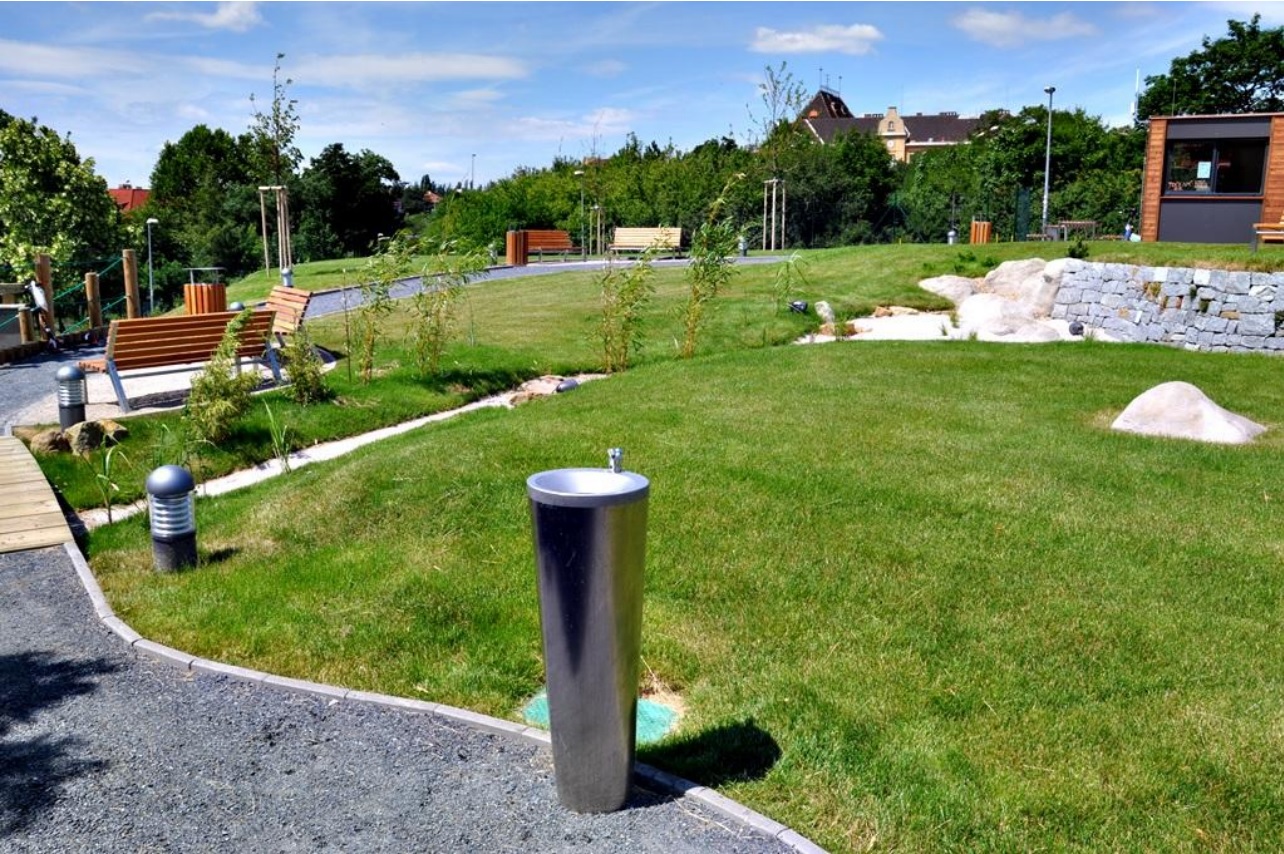 Egy modern kivitelű, formatervezett köztéri ivókút nyomógombos szeleppel és egyszerű kezelőszervekkel. A városi bútorok megfelelő kiegészítője széles közönség számára