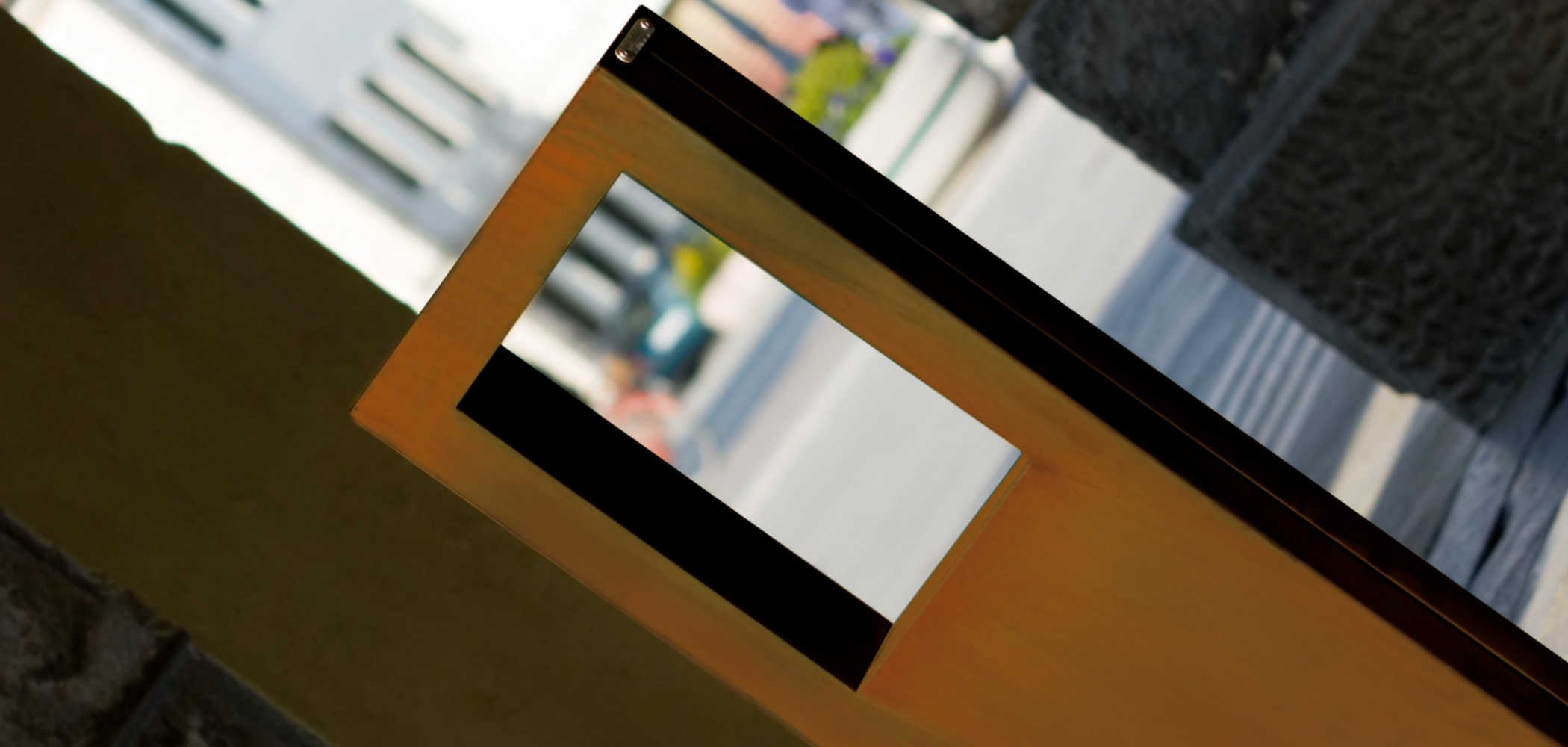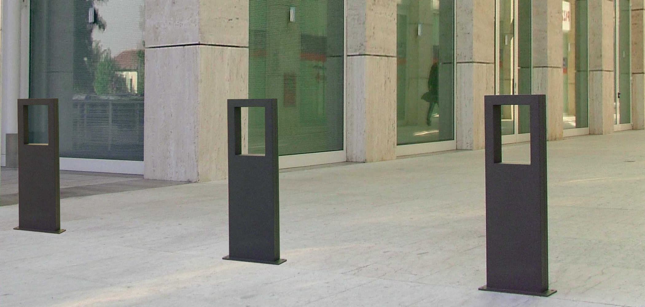 Hajtogatott, préselt acélból készült gyalogos poller vagy kerékpártartó, központi téglalap alakú ablakkal.