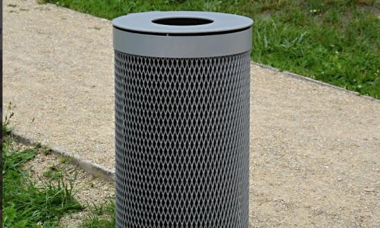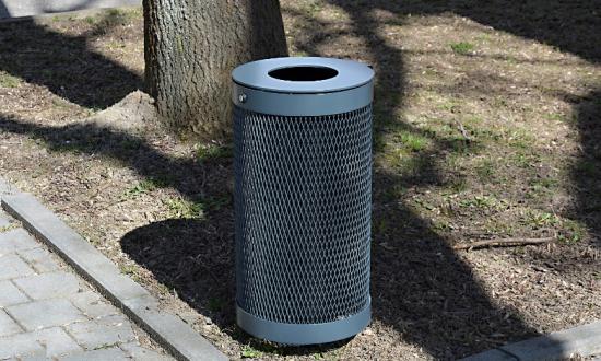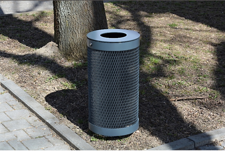 Nehéz és masszív, acél, kültéri szemetes, durván feszített fémlemezből készűl. A reteszelő nyílással zárható fedél védi a belső polipropilén leszerelhető tartályt.