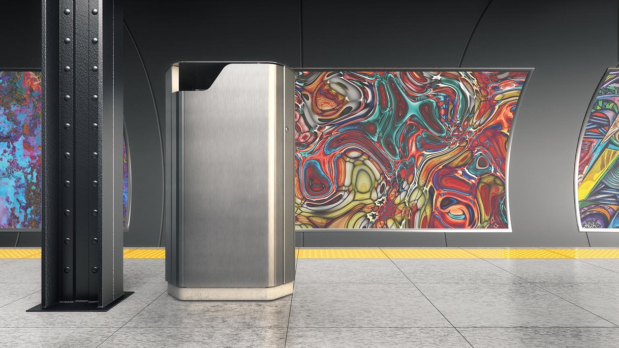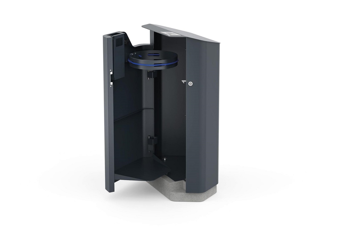 Acéllemez szerkezetből, esővédőből és ajtóból álló szemetes, pattintható zárral és hamutartóval, beépített tároló- és zsáktartó gyűrűvel gumival. A felső részben rozsdamentes acél lemez teszi lehetővé a cigaretta oltását. A szemetes hatszögletű beton alapon áll.