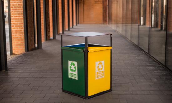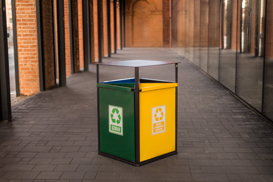 Tetővel ellátott szelektív hulladékgyűjtő. A termékcsalád új változata. Porszórt acélból készült, esztétikailag kitűnően kiegészíti az építészet elemeit a köztereken.