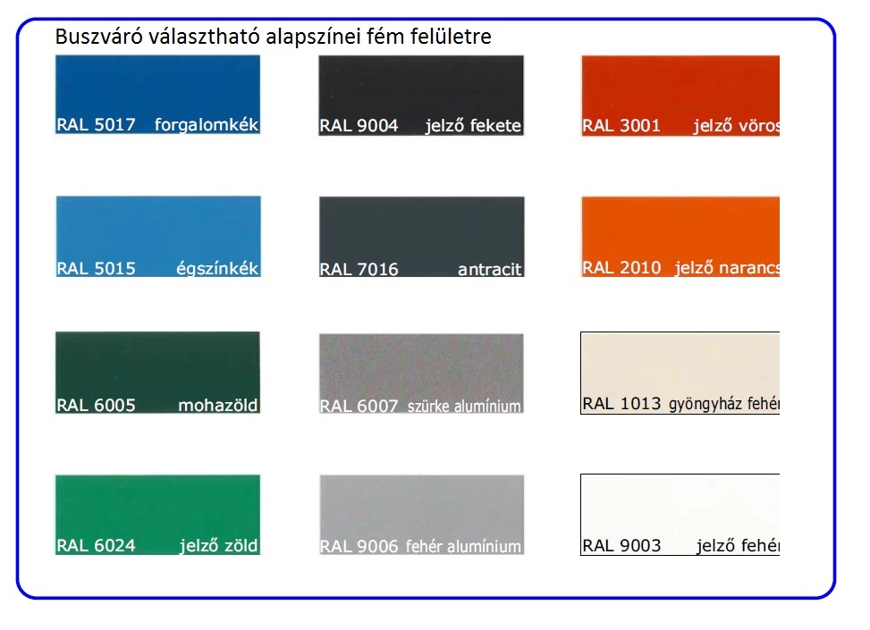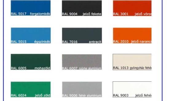 - Szerkezet: hegesztett alumínium váz, porfestés a kívánt RAL kód szerinti színben, min 35 µ rétegvastagsággal